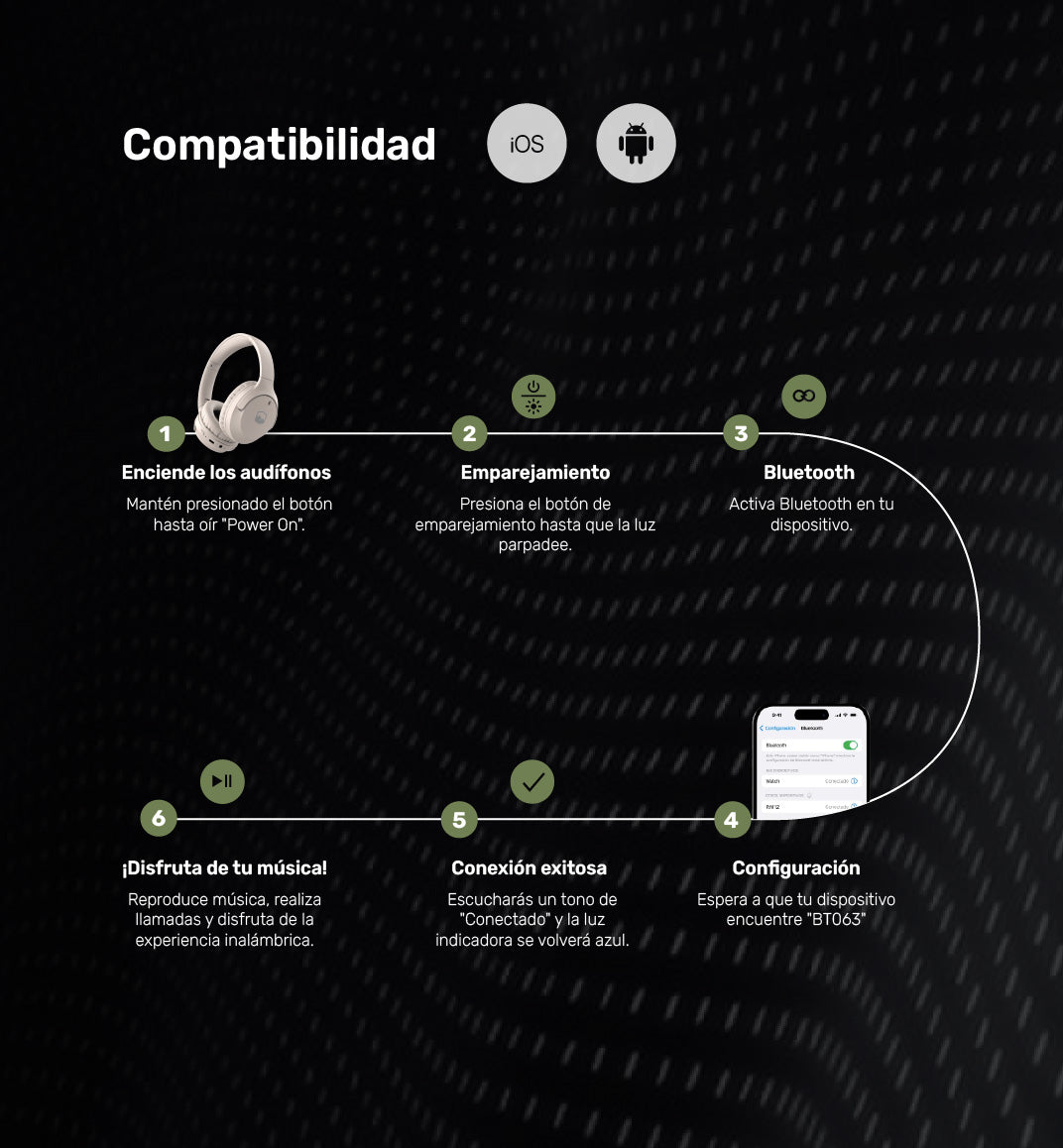 Llévalos contigo a donde vayas. Su diseño plegable y liviano, de solo 210 gramos, es perfecto para transportarlos fácilmente en cualquier aventura, mientras que los materiales de alta calidad (PU+ABS+Metal) aseguran durabilidad y estilo. Además, disfruta de llamadas claras con su micrófono integrado y cambia sin esfuerzo entre la función Bluetooth y Aux-in según lo necesites.