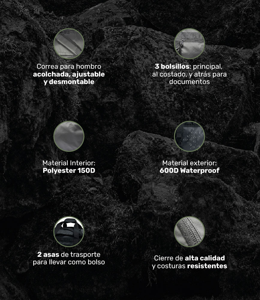 • Bolsillos: 3 (principal, al costado y atrás para documentos)
