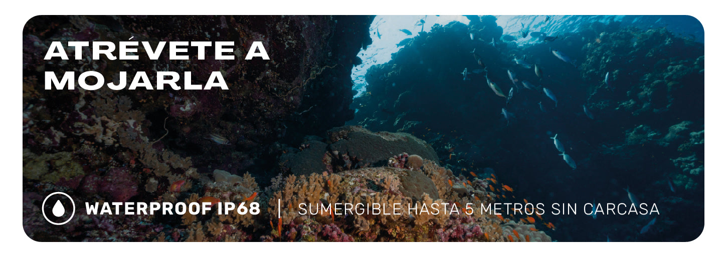 Sumergible y 100% todo terreno: Olvídate de carcasas extras y complicadas. Su cuerpo cuenta con certificación IP68, lo que la hace resistente al agua y sumergible hasta 5 metros por sí sola. Nieve, lluvia, barro o agua; esta cámara lo resiste todo.