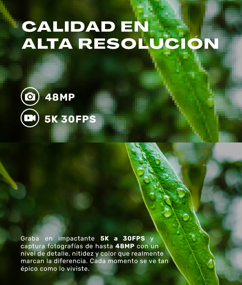 Calidad de imagen que impacta: Equipada con el poderoso sensor Sony IMX386 de 48 megapíxeles y grabación de video en asombroso 5K a 30fps. Inmortaliza tus mejores momentos con colores vibrantes, máxima nitidez y una estabilización electrónica (EIS) de 6 ejes para que tus tomas siempre salgan fluidas, sin importar los saltos o la velocidad.