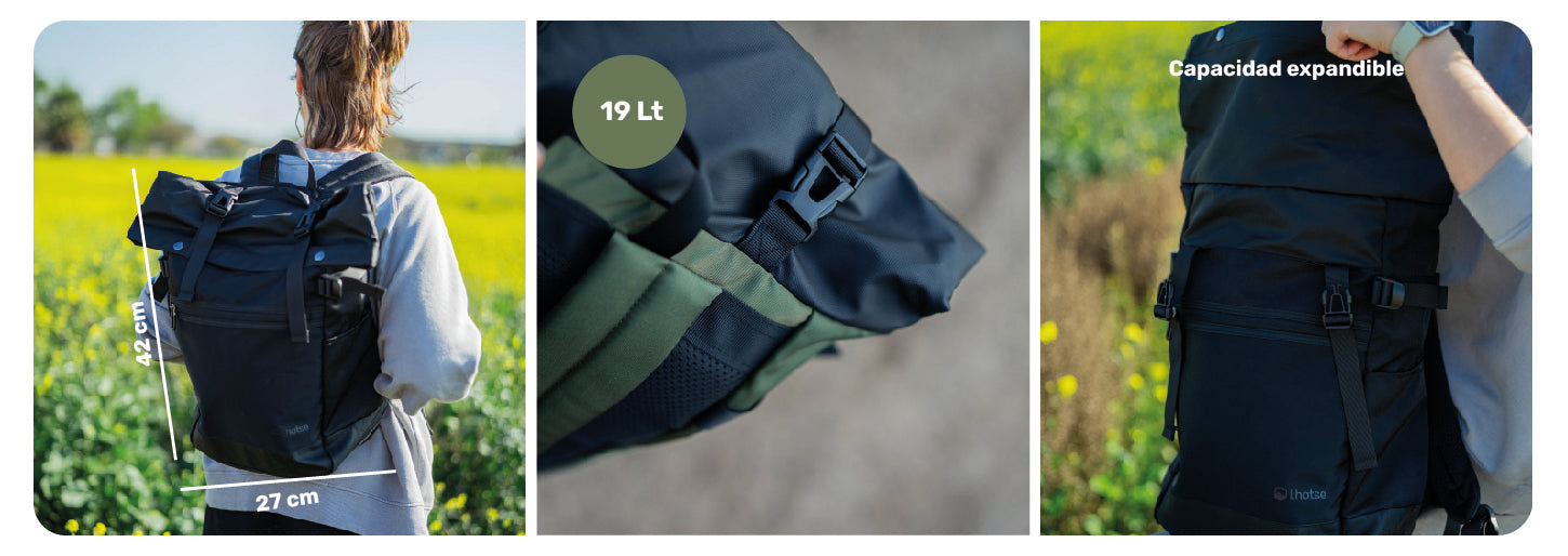 ¿Lo mejor? Tiene una capacidad de 19 Litros pero puede expandirse por su cierre enrollable de la parte superior.