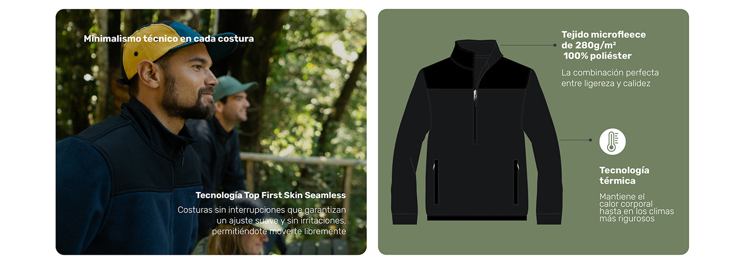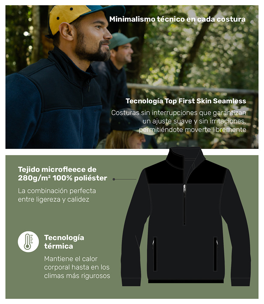 • Tejido microfleece de 280g/m²: 100% poliéster que ofrece una combinación perfecta de ligereza y calidez, ideal para mantenerte cómodo en cualquier aventura, sin perder movilidad.