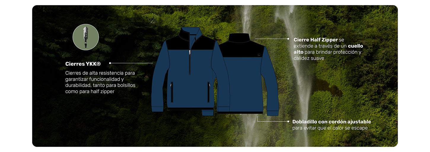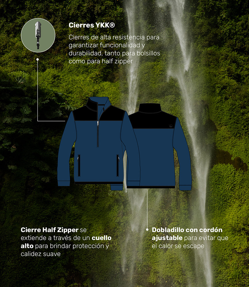 • Cierre Half Zipper se extiende a través de un cuello alto para brindar protección y calidez suave.