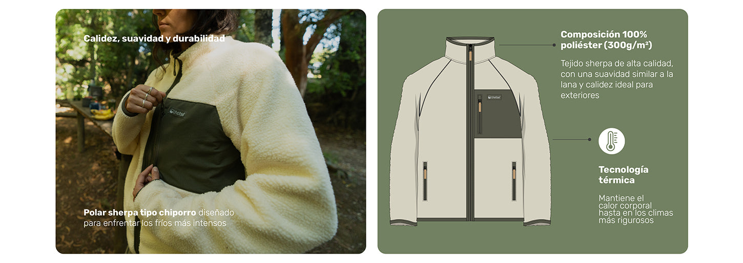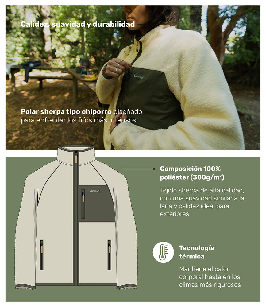 Grueso, cálido y con textura que abraza. Este polar sherpa tipo chiporro está diseñado para enfrentar los fríos más intensos con estilo y abrigo superior. Inspirado en las rutas nevadas del Himalaya, ofrece una experiencia térmica inigualable gracias a su suave forro de alto gramaje.